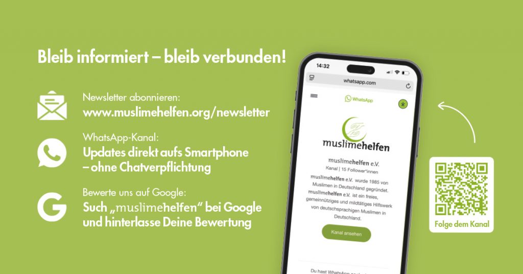 Zum 40-jährigen Bestehen von muslimehelfen danken wir Dir von Herzen für Deine Unterstützung. „Ich spende bei muslimehelfen, weil ich weiß, dass meine Hilfe dort ankommt, wo sie gebraucht wird.“ „Ob akute Nothilfe oder langfristige Projekte wie Brunnenbau oder Bildung – ihr schafft echte Perspektiven.“ „Eure Arbeit ist transparent, zuverlässig und orientiert sich an islamischen Werten – das gibt mir Vertrauen.“ Diese Rückmeldungen zeigen: Unsere Arbeit ist mehr als Hilfe – sie ist Ausdruck gelebter Verantwortung.